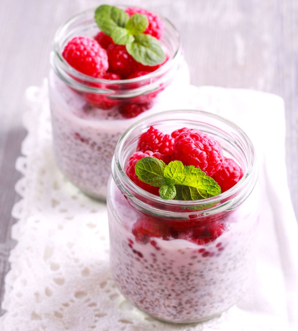 Pon las semillas de chía en un vaso con la leche y mézclalo un poco. Ponlo todo en la nevera durante media hora. Durante este tiempo haz un puré con las frambuesas. Si las encuentras demasiado amargas, añade un poco de jarabe de agave hasta que sean lo suficientemente dulces. Una vez que las semillas de chía se hayan asentado, añade el puré en la siguiente capa. Ahora añade el yogur y finalmente usa las frambuesas restantes como topping. ¡Delicioso!