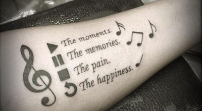 Desde las clásicas claves de sol, de fa y de do, o los pentagramas con notas musicales, hasta los más elaborados que incluyen instrumentos, sombreados o micrófonos, en este álbum encontraras más de 60 ideas de tatuajes musicales diferentes, para que elijas el que más te guste.