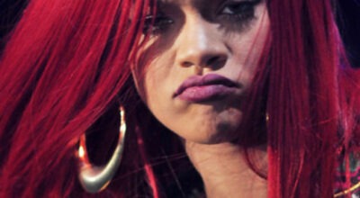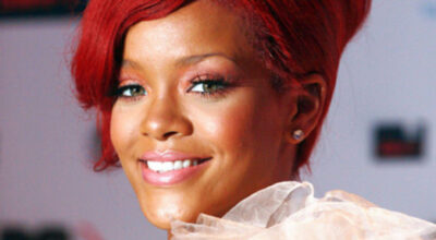 Rihanna muestra una cabello rojo con una femenina cinta posando en el centro comercial de Westfield, Nov 2010