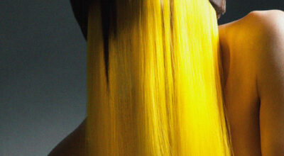 Cabello amarillo y azul con flequillo por Aveda.