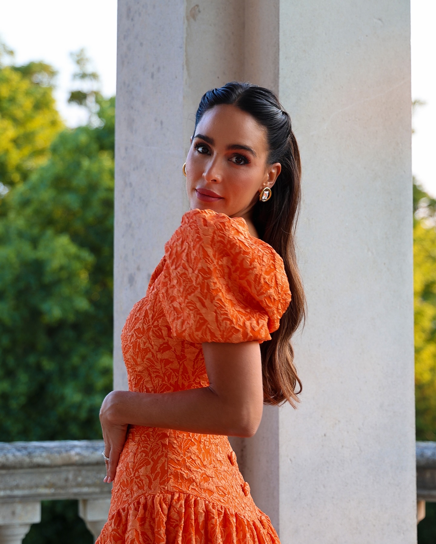 Aquí te traemos otra alternativa que puedes valorar y no requiere de mucho esfuerzo. Se trata de un semirecogido lateral, donde simplemente sujetas los mechones de ambos lados sin juntarlos en la parte trasera de la cabeza. Rocío Osorno lo ha lucido ideal, complementando su look con un elegante vestido naranja de mangas abullonadas.