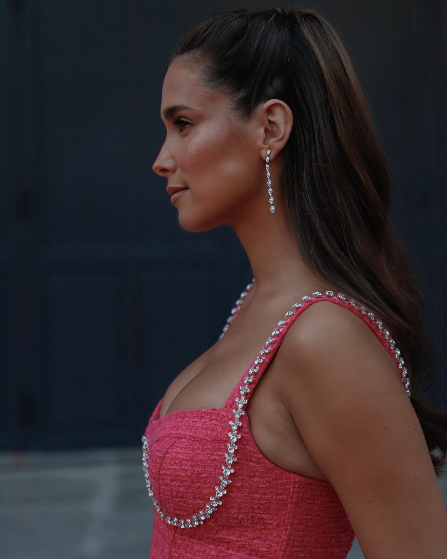Una coleta alta en el semirecogido es una excelente elección para aquellas con melena larga, ya que ayuda a disminuir visualmente la densidad del cabello. Este estilo es especialmente favorecedor para los rostros redondos, ya que alarga y estiliza las facciones. Un ejemplo perfecto de cómo lucir este peinado lo dio María Pombo en el estreno de Barbie, donde su coleta alta no solo complementó su look, sino que también destacó su elegante perfil.