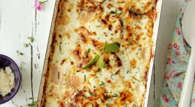 Para empezar, ponemos el horno a precalentar a 180º durante 15 o 20 minutos aproximadamente. Mientras tanto, con la ayuda de una mandolina, cortamos las patatas sin piel en rodajas de aproximadamente 5 mm de espesor. Después, untamos la bandeja del horno con mantequilla y colocamos una primera capa de patatas. Agregamos el ajo machacado, sal, pimienta y nuez moscada. Encima colocamos otra capa de patatas y repetimos la operación hasta terminar con toda la cantidad.