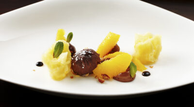 El restaurante La Manzana es, sencillamente, exquisito. De entrada por su decoración, un cubículo de líneas rectas donde conviven el blanco vivo de las mesas con la acogedora y envolvente madera clara. El enclave no puede ser más ideal: un amplio atrio bañado de luz cenital y rodeado de limoneros. Pero la verdadera experiencia llega con los platos de su chef, Esteban González.