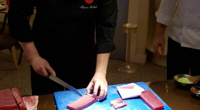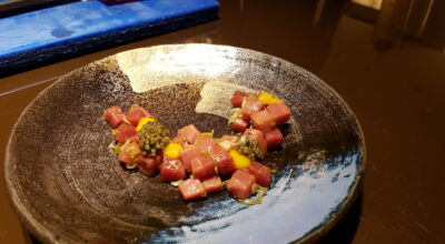 Tras abrir boca en el Scotch Bar, continuamos la ruta hacia la segunda etapa de nuestro periplo, el restaurante Hikari. Tal y como nos cuentan, Hikari significa «luz» en japonés, «algo que dota de sentido a nuestro espacio y a todos nuestros platos». Lo podemos comprobar a través de su despiece de atún rojo en vivo, una auténtica ceremonia en la que cada movimiento, fluido y delicado, resulta en una sabrosa obra de arte. Se sirve en tartar, con yema de huevo, wasabi, soja y aceite de oliva virgen extra. Y lo maridan con cava, que armoniza a la perfección con el plato, potenciando su sabor con el máximo respeto.