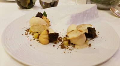 Como postre, redescubrimos el perfume, el color y la textura de las setas de nuestros bosques. La composición más dulce del otoño se derretía en nuestro paladar aportando el sabor intenso de estos preciados vegetales, combinados con un helado que aportaba frescor a la creación.