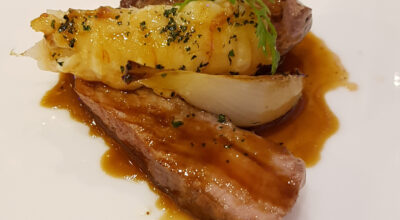 © Asado de tira de ternera con glaseado de calabaza y puré de patata