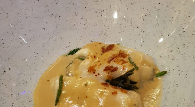 «En esta primera fase nos apoyamos en conservas, por ejemplo, un escabeche con wakame y crujiente de patatas, todo completamente artesanal. Cambiamos la carta cada 2-3 meses, para que nuestros clientes recurrentes también puedan encontrar algo nuevo», nos explica Trabuchelli al entrar en el Scotch Bar, un relajante espacio de decoración moderna pero cálida, con tonos color café claro y madera. «Preferimos una carta de tapas corta, especializadas y de calidad, antes que abrumar a nuestros clientes con muchas propuestas», aclara. Comenzamos la ruta con una de ellas, el falso filipino de calamar, una auténtica delicia que se deshace en la boca.