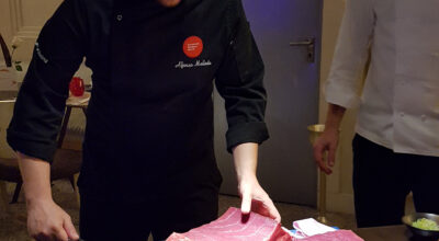 En su cocina, creativa e innovadora, trabaja siempre con los mejores productos de temporada. En esta ocasión, nos propone el Chipirón plancha con jugo de tomate asado y trigueros, la Merluza de pincho con pil pil de miso y salicornia y, como colofón, la Picaña de ternera con caviar de berenjena y cebolleta holandesa.