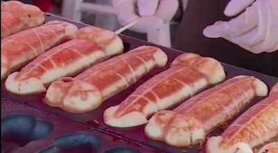 El D- Cake, que así se llama, es propio de la gastronomía taiwanesa y ha llegado a Estados Unidos a través del Mercado Arcadia 626 en Los Angeles. Se elabora con una masa muy similar a la del gofre y se rellena de chocolate. Para obtener su peculiar forma, se utiliza un molde con un funcionamiento comparable a una sandwichera. Y, por si su forma no fuese suficiente polémica, sobre el dulce en cuestión se agrega una especie de sirope blanquecino que, como podéis imaginar, ha añadido aún más polémica al asunto.