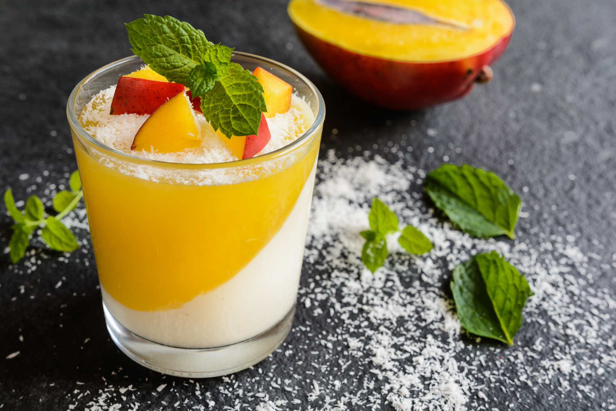 A continuación, rellenamos cada una de las copas con esta mezcla y las llevamos a la nevera durante al menos 4 o 5 horas. Una vez pasado este tiempo, sacamos y decoramos con algunos trocitos mas de mango.
