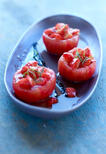 Dos tomates grandes + fresas de temporada + azúcar: ¡unos sorprendentes tomates rellenos! ¿No está mal probar por primera vez unos tomates rellenos dulces-salados, no?