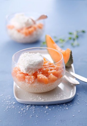 Montar la nata líquida con una batidora eléctrica y añadir progresivamente la nuez de coco rallada. Verter en unos boles la tapioca ya fría y añadir, a continuación, una capa de dados de melón bien frescos y terminar con una montañita de nata montada firme y fría con nuez de coco.