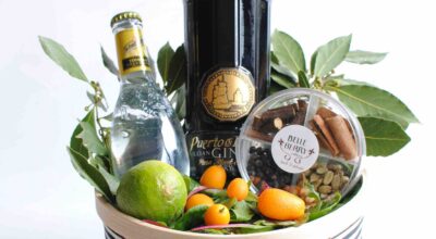 Incluye una botella de ginebra Puerto de Indias "Puré black", una tónica Schweepes, un kit de aromáticos para todos los gustos, limón y un puñado de kumquats, para darle un toque ácido diferente.