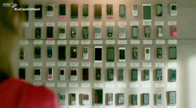 Primera temporada. Seguramente, también te haya chirriado a ti. En el plano que enseña los teléfonos requisados a todos los rehenes, vemos un mejunje tecnológico de todas las épocas: smartphones, backberries y teléfonos prehistóricos. Aunque no nos cuadra mucho, ¿será hecho a propósito?