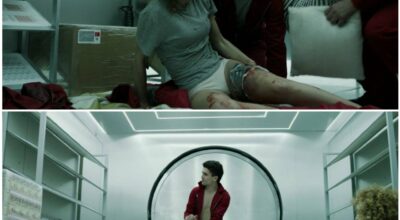 Primera temporada. Denver ha hecho pasar por muerta a Mónica: la tiene escondida en una cámara acorazada. Recordemos que están secuestrados y, por tanto, tienen la misma ropa que el día que se inició el atraco. Pero entre una escena y otra, la ropa interior de Monica cambia: primero es rosa, después, negra.