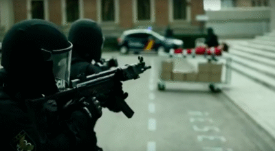 Segunda temporada. Al inicio, Tokio (interpretada por Úrsula Corberó), es entregada a la policía por Berlín, maniatada en una camilla de la que cuelgan cajas de cartón. Enseguida, caen en la cuenta de que puede llevar explosivos. Así que la obligan a quitarse el mono y las botas. Pero, ¿y las cajas de la camilla?