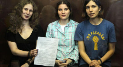 17 de agosto, Moscú – El grupo punk feminista Pussy Riot se atreve a hacer una actuación artística un tanto particular con el fin de expresar su oposición a Vladimir Putin, primer ministro en campaña electoral para las elecciones presidenciales. En una iglesia ortodoxa, 5 miembros del grupo entonaron una “oración punk” que pedía a la Virgen que acabara con Putin, con algunos términos políticamente incorrectos. Nadejda Tolokonnikova, Ekaterina Samoutsevitch y Maria Alekhina fueron arrestadas y las otras 2 serán condenadas por vandalismo a dos años de prisión. Numerosas personalidades políticas, intelectuales y del mundo del espectáculo apoyaron públicamente a estas 3 chicas.