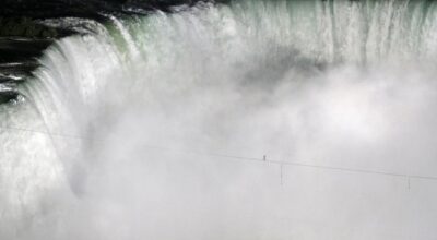El acróbata funambulista Nik Wallenda camina sobre las cataratas del Niágara.