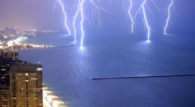Seis rayos fotografiados a la vez en el Lago Michigan.