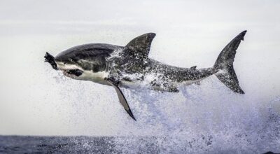 Un gran tiburón blanco sale disparado del agua en Ciudad del Cabo, Sudáfrica.