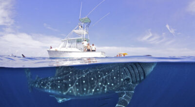 Un tiburón ballena curioso se asoma a ver qué pasa.