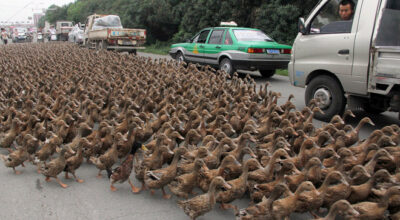 El tráfico se detiene ante la llegada de 5.000 patos que cruzan esta carretera de Zhejiang, en China.