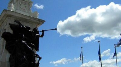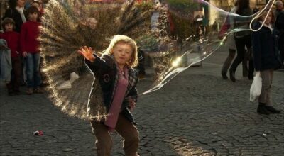Momento exacto en que se explota una gran pompa de jabón en París.