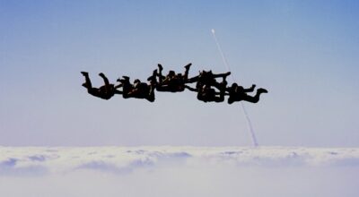 La lanzadera espacial Discovery se pone en órbita durante el descenso de estos paracaidistas.