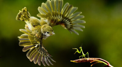 En esta vemos cómo una mantis religiosa se defiende de un pájaro que intenta hacer de ella su merienda.