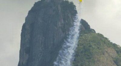 Una avioneta rinde homenaje al Cristo de Corcovado en Río de Janeiro.