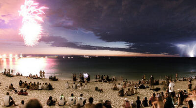 Fuegos artificiales, cometas y relámpagos en una misma imagen.