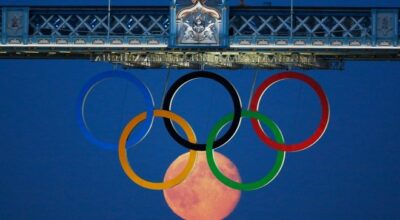 La Luna asciende a través del emblema de los Juegos Olímpicos de Londres.