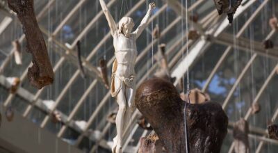 El peculiar artista ha aprovechado la singular arquitectura del Palacio de Cristal para encerrar en una gran vitrina objetos tan llamativos y dispares como 600 fósiles de mamut, un Cristo de marfil del siglo XVII, una fotografía del primer paseo espacial o un cartón vacío de leche.