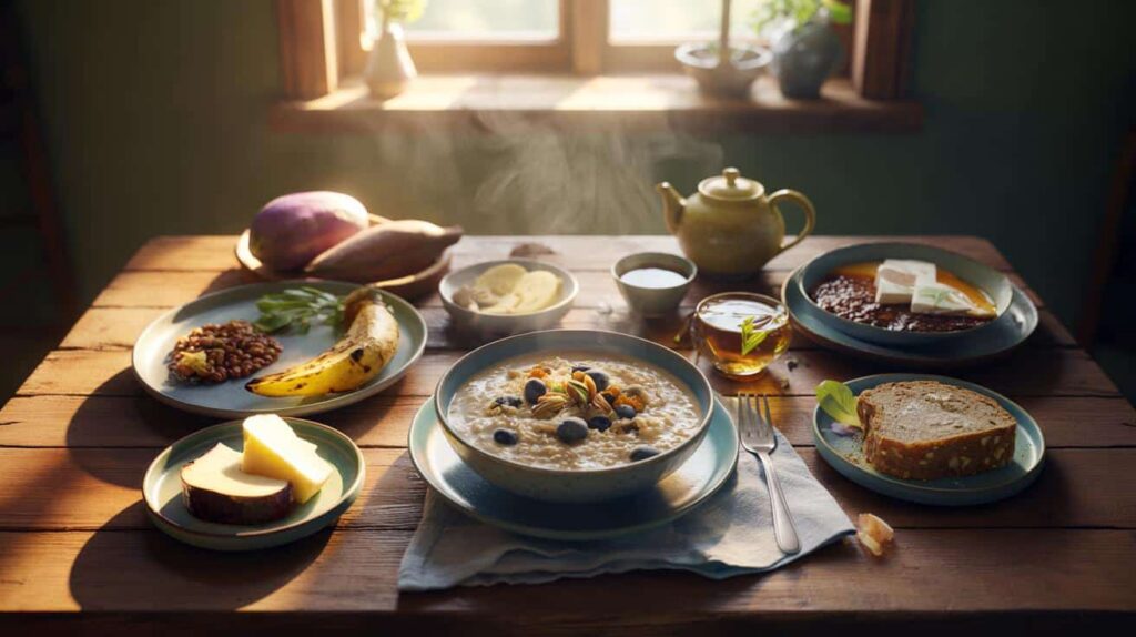 Las personas que llegan lejos eligen desayunos sencillos, salados, de casa. Lo que aparece una y otra vez en esos platos son sobras de guisos, panes integrales, tubérculos humildes y tazones de avena con frutos. Pesa el hábito más que la moda: casi siempre plantas, muy poca azúcar, nada de ultraprocesado de pega. En la mesa de las **Zonas Azules**, la mañana empieza lenta y con fibra.