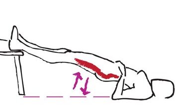 Volvemos a estar boca arriba, pero esta vez, debes mantener los brazos pegados al cuerpo. Dobla las rodillas, pero sin despegar los pies del suelo. A continuación, levanta la pelvis hasta conseguir levantar tu cuerpo y que sólo queden pegados al suelo los omóplatos y los brazos. Más o menos, esta figura asemeja a un puente, de ahí su nombre. Sube y baja en tandas de 8.