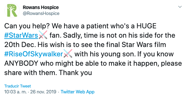 El post, retuiteado más de 1300 veces, llegó a Bob Iger, quien aceptó hacer realidad el sueño del paciente de poder ver la película con su hijo antes de morir. Un hombre fue también al Hospital Rowans en Portsmouth tres días después, acompañado por dos clones, un Jedi y un Chewbacca. El paciente pudo ver así la película con su familia.