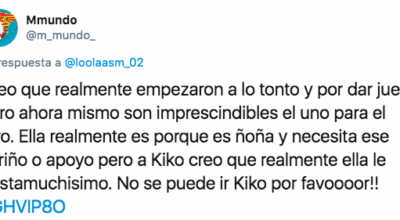 ‘’¿Has visto lo caprichosa que soy ya, verdad?’’ Y Kiko como, ‘‘¿qué? ¿dónde? ¿qué está pasando, qué invento es este?’’ ‘’Soy caprichosa de atención, estabas con Adara y yo quería hablar contigo y quería yo hablar contigo y estar yo contigo y nadie más’’. ¡Tócate la peineta, Manolo! ¿Caprichosa de que, mujer? ¿No decías que solo era tu amigo? Y por otro lado el falsuno máximo de Kiko haciendo entender que fue él el que termino la broma con Adara cuando en realidad, debería darle las gracias por aportarle esas risas que tanto le faltan al chaval.