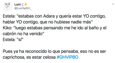 A ver ahora como nos comemos eso de: ‘’somos solo amigos, Diego no tiene nada que temer, cuando salgamos fuera nos iremos los cuatro de vacaciones’’. La careta que sostenía Estela Grande con un hilillo del tamaño de una uña ya se le ha caído del todo; después de asegurar que lo suyo con Kiko es simplemente un montaje, una sucia estrategia para permanecer dentro del concurso, el último movimiento de Kiko acercándose a Adara ha demostrado lo que todos nos temíamos, a Estela le gusta el sevillano, bueno, no es que le guste, es que le encanta porque, sin pelos en la lengua, ha reconocido abiertamente a su compañero ser muy ‘’caprichosa’’ y no querer compartirle con nadie. Pero, ¿no eran solo amiguis?