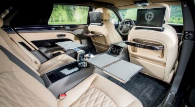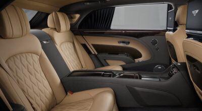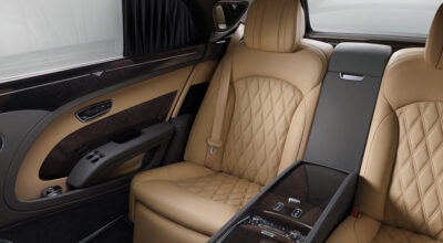 El nuevo Bentley Mulsanne Extended Wheelbase está pensando para todos aquellos pasajeros que viajan en los asientos traseros. El coche incorpora un reposapiés extensible, amplio techo solar (que pueden controlar tanto los pasajeros como el conductor), función de masaje en los asientos e incluso un refrigerador con copas de cristal fabricadas a medida. Además, para los adictos al trabajo, el coche incluye una consola personalizable con los materiales más exclusivos, que incluye puertos USB, portabolígrafos, Wifi 4G y para los más recelosos de su intimidad, cortinas.