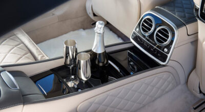 Por supuesto, incluye asientos reclinables con función masaje, varias opciones para cargar smartphones y un completísimo sistema de entretenimiento. Como en el Bentley, puedes disfrutar de una copa de champán en carretera.