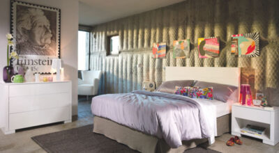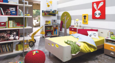 Para los más pequeños puedes utilizan vinilos de diferentes figuras en las paredes y muebles asimétricos y muy coloridos que, aparte de quedar fenomenal, son muy divertidos. Un ejemplo es este dormitorio con mesillas con ruedas, 169 €, cama y perchero en forma de árbol, una estantería para sus libros por 635€ y, para rematar, un puf de 99€.