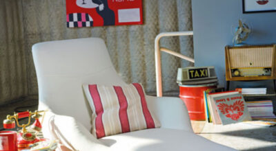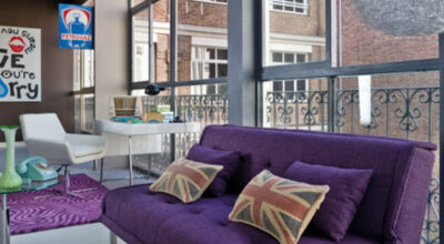 La decoración con colores vibrantes y alegres es lo habitual en este estilo. ¿Qué te parece este sofá morado? Es sofá y, además, cama (450€). ¡Tus invitados también querrán estar a la última!