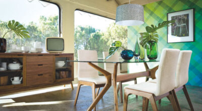 En el comedor puedes utilizar muebles con formas especiales y con un toque más rústico como estos de nogal: el aparador lo encontrarás por 625€, la mesa por 490€ y las sillas por 122€ cada una.