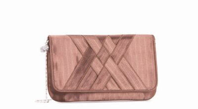 Bolso rosa pastel de fiesta en raso con cadena plateada