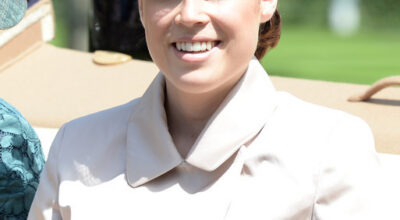 La princesa Eugenia con un elegante tocado en color blanco roto.