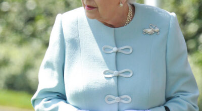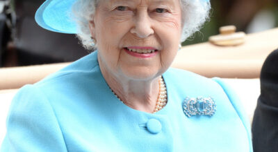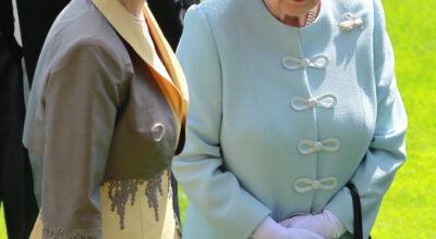 La reina Isabel con un conjunto en azul cielo paseando por Ascot.