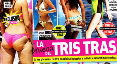 La revista Cuore se dedica esta semana a analizar el pecho y el trasero de las famosas en bikini. En su portada aparece la actriz Hiba Abouk, la periodista deportiva Sara Carbonero y la también actriz Lindsay Lohan.