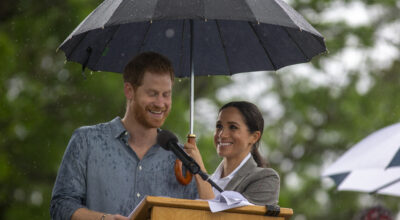 Esta imagen suscitó algo de polémica en Reino Unido: Meghan Markle sujeta el paraguas para cubrir a Harry mientras este pronuncia un discurso.