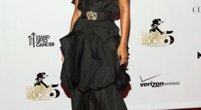 Para los Premios Grammy 2009, eligió un vestido largo sin tirantes de Gucci.